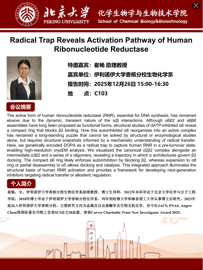大家好,2025年12月26日(星期五),化学生物学与生物技术学院邀请了University of Illinois Urbana-Champaign化学生物学系的崔畅助理教授到访我院并进行化学生物学前沿讲座,欢迎大家参加!