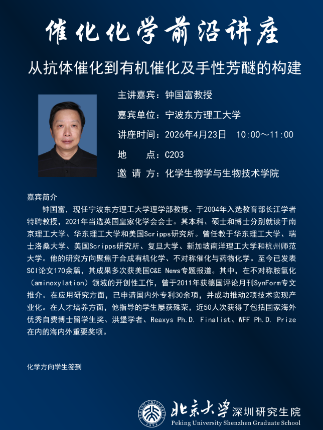 大家好,2026年4月23日(星期四),化学生物学与生物技术学院邀请了宁波东方理工大学钟国富教授到访我院并进行“从抗体催化到有机催化及手性芳醚的构建”的讲座,欢迎大家参加!